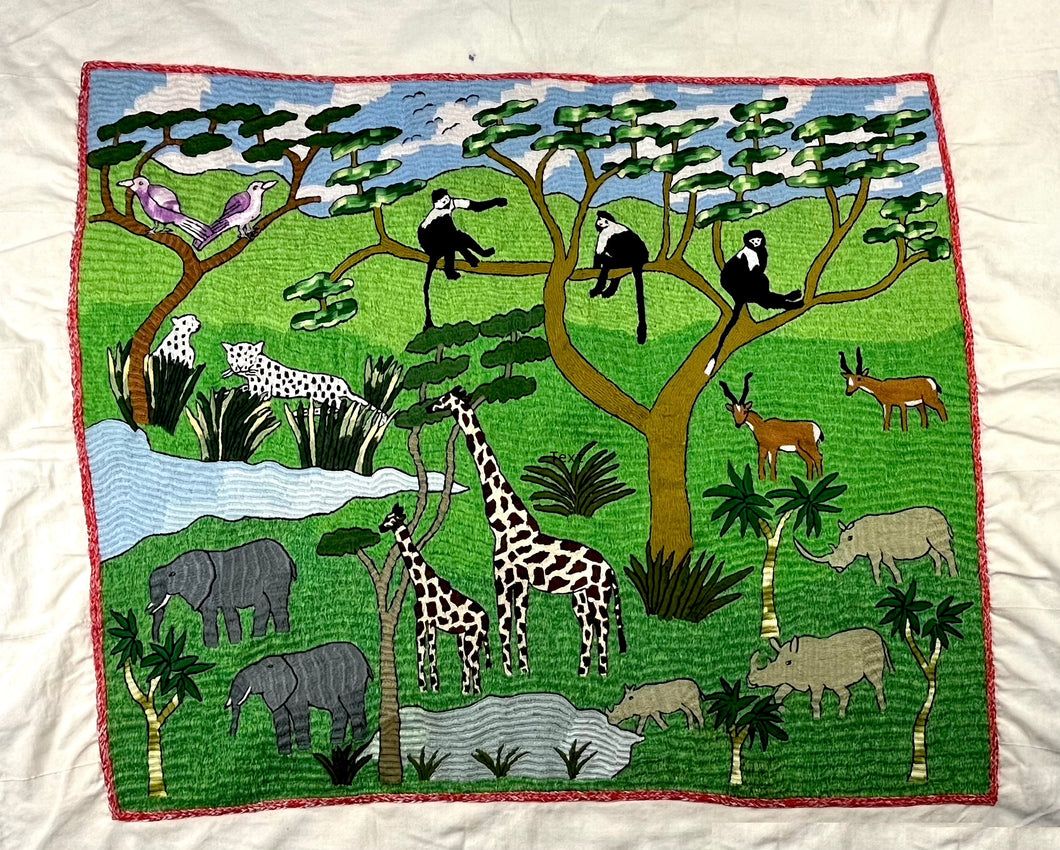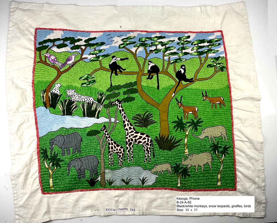 This wonderful hand-stitched tapestry, created by Phinoa Kasoga, Threads of Blessing artist, offers a birds-eye view of a Ugandan forest. Birds and monkeys are perched high in the canopy, while snow leopards, kob, giraffes, elephants, and rhinoceros are seen on the forest floor. Every inch of this large work, which measures 33 x 27 inches, offers something for the viewer.