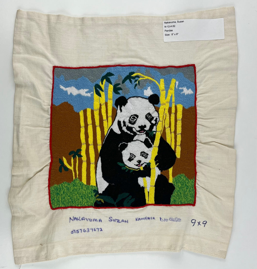 A mother panda and baby, nestle in a bright yellow patch of bamboo in this hand-stitched tapestry created by Suzan Nakavuma, Threads of Blessing artist. The work measures 9 x 9 inches.