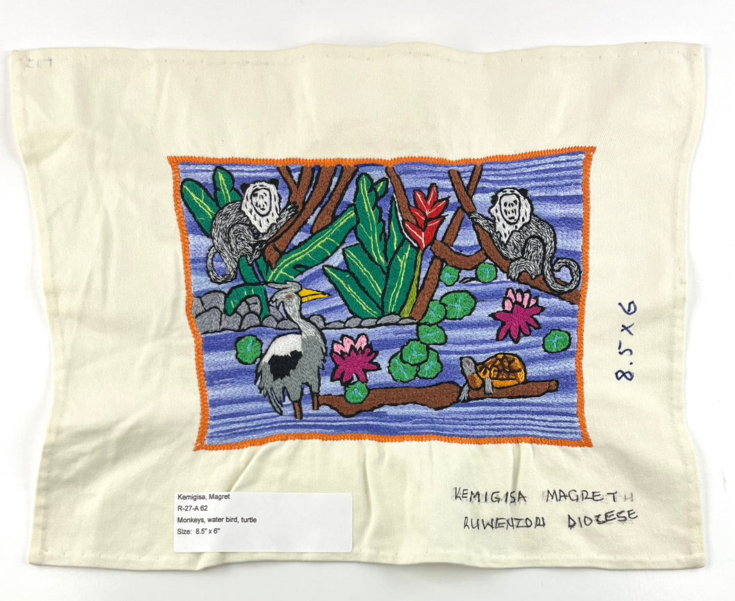 A turtle, crane, and monkeys congregate in a pond surrounded by lily pads and flowers. This wonderful hand-stitched tapestry created by Margret Kemigisa, Threads of Blessing artist, measures 8.5 x 6 inches.