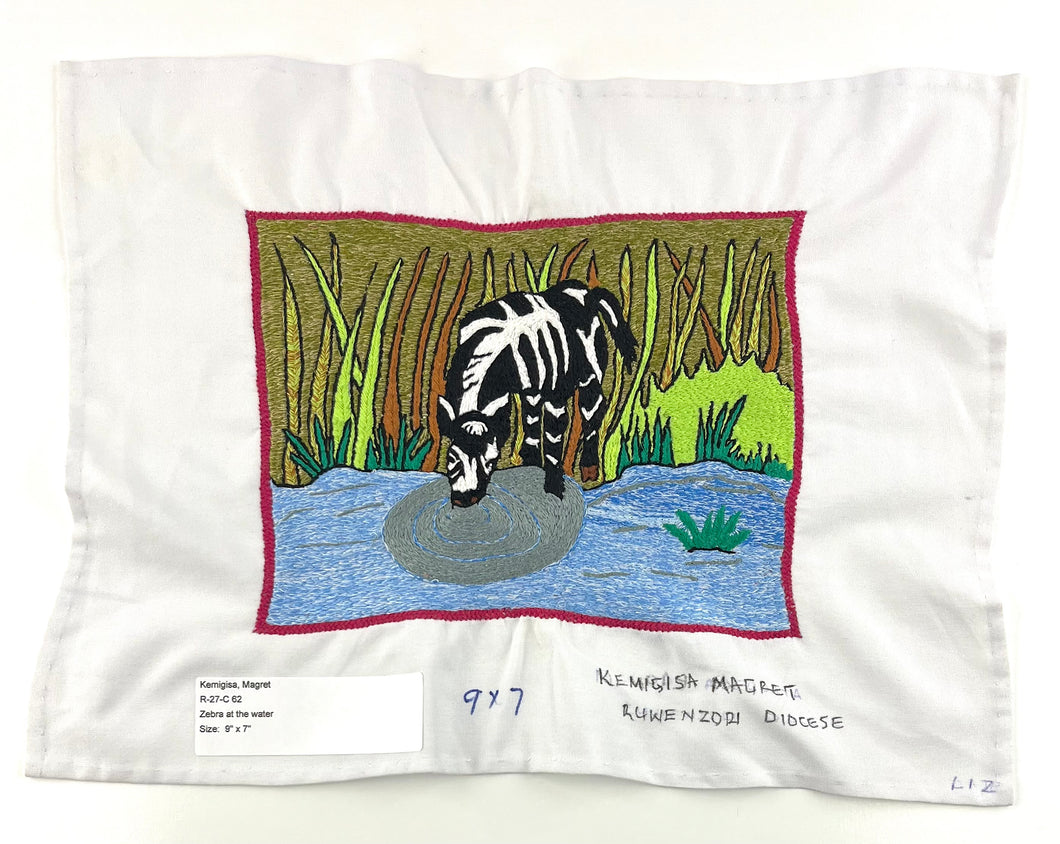 A lone zebra drinks at a waterhole in this hand-stitched tapestry created by Magret Kemigisa, Threads of Blessing artist. The uncomplicated composition paired with a variety of stitches creates a lovely snapshot of life on the savannah.